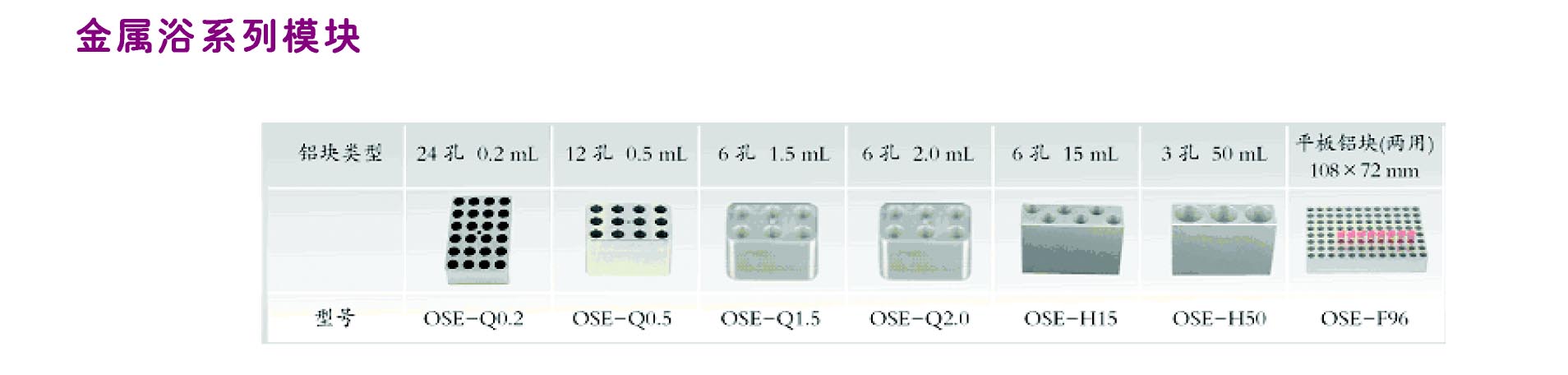 模块切换简单,可任意组合0.2ml到50ml各种离心管的模块。选配模块可选择0.2ml,0.5ml,1.5ml,2.0ml离心管的模块(购买时需标明)。体积轻巧,可置于超净工作台中。分块降温,不易烫伤,避免污染。 12V,5A直流电源,耗电小,可接入车载电源,用于野外实验金属冰浴(OSE-96)的使用可避免湿冰融化带来的不便及污染等问题技术指标 直流供电 12V, 5A,由转换器插入市电控温范围 0~100℃ 使用环境温度 8~30℃ 温度稳定性 <±0.5℃ 模块温度均匀性 <±0.5℃ 显示精度 0.1℃ 外形尺寸 185 x 185 x 90 mm 工作板尺寸 110 x 72.5 mm,与96孔PCR板相配。机身重量 1.4kg 包装重量(含铝块) 2.5kg.